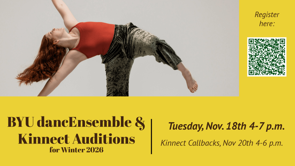 - BYU dancEnsemble and Kinnect Auditions | For Winter 2026 | Nov. 18 at 4:00-7:00 p.m. | Note that callbacks for Kinnect will be on Nov. 20 at 4:00-6:00 p.m. | Register here