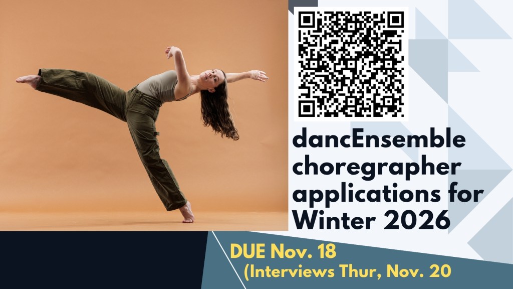 - dancEnsemble Choreographer Application Due | Nov. 18 | Interviews will be held on Nov. 20 | Apply here