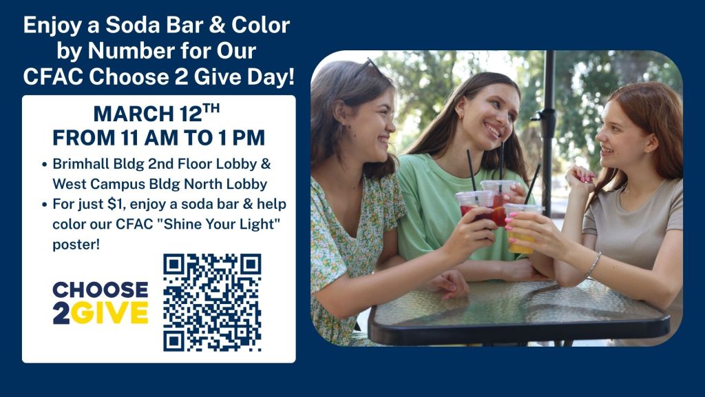 CFAC Choose 2 Give Day | March 12 at 11:00-1:00 p.m. at the Brimhall Bldg 2nd Floor Lobby and the West Campus Bldg North Lobby
